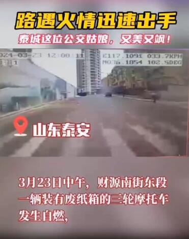 3月23日中午,財(cái)源南街東段一輛裝有廢紙箱的三輪摩托車(chē)發(fā)生自燃,千鈞一發(fā)之際,泰安公交第一分公司10路線駕駛員張南南拎起滅火器奔向自燃的車(chē)輛,迅速將火情控制并撲滅,得到乘客和路人的一致稱(chēng)贊。
