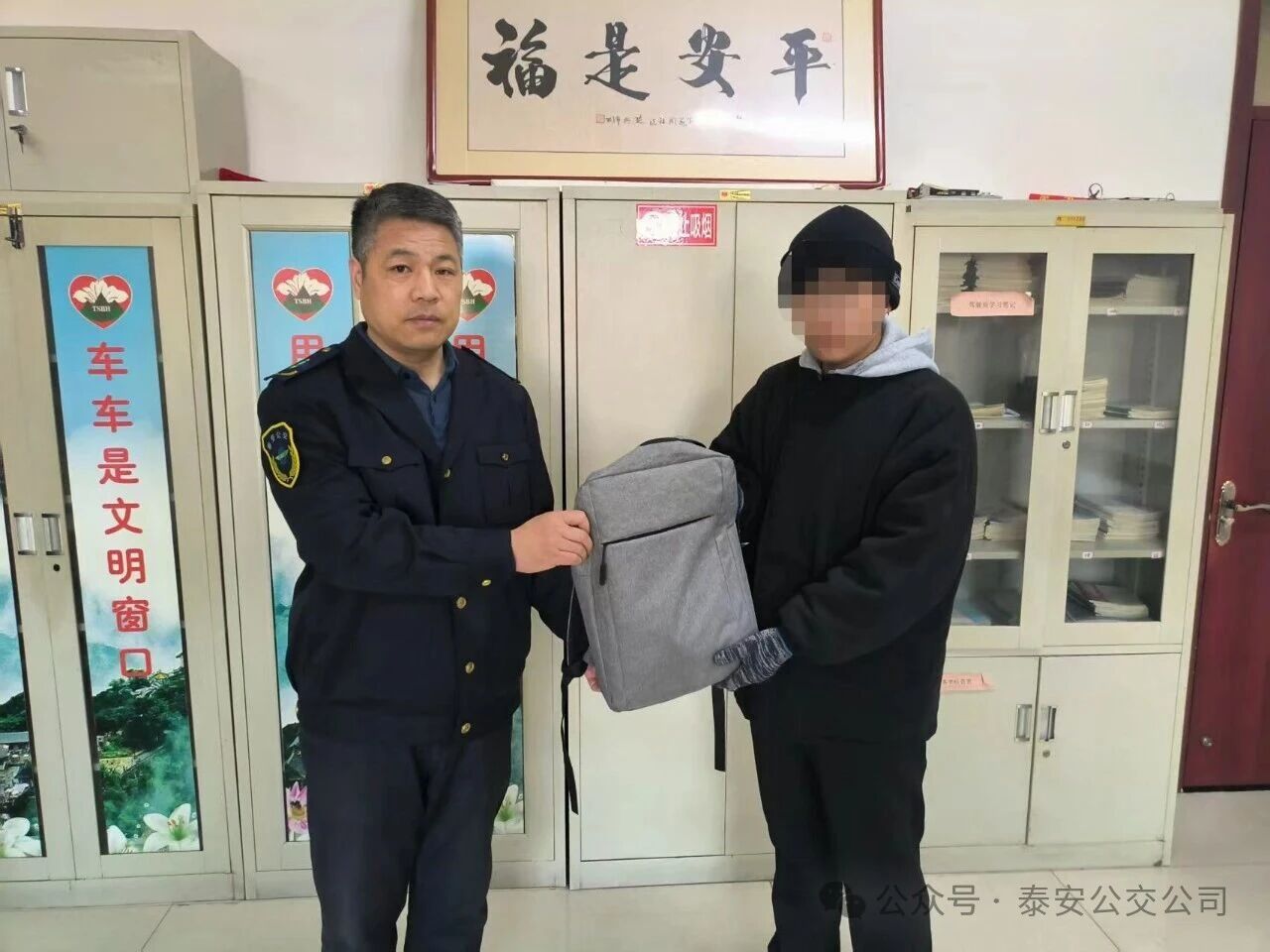 近日,泰山職業(yè)技術學院的齊同學專程來到泰安公交第三分公司,順利領回了自己失而復得的背包??粗嘲鼉葍r值5000余元的筆記本電腦和父母給的200元現(xiàn)金分文未少,齊同學難掩激動,連連對39路公交車駕駛員侯同尚及分公司工作人員的熱心幫助表示感謝。