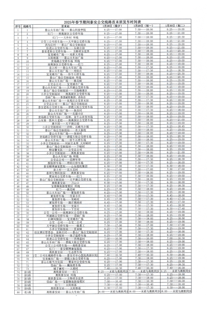 為切實(shí)保障好春節(jié)期間市民出行,泰安市公共交通有限公司結(jié)合市民節(jié)日出行規(guī)律和變化,統(tǒng)籌考慮安排公交線路首末班發(fā)車時(shí)間,1月28日、29日(除夕、初一)將對(duì)所屬營(yíng)運(yùn)線路發(fā)車間隔、首末班時(shí)間等作出調(diào)整(具體情況見附表)。